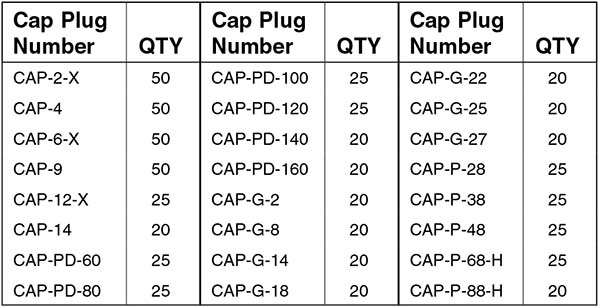 Our new and improved cap plug kit contains 22% more cap plugs in an environmentally friendly corrugated box. Separated areas hold 625 cap plugs in 24 of the most popular sizes.